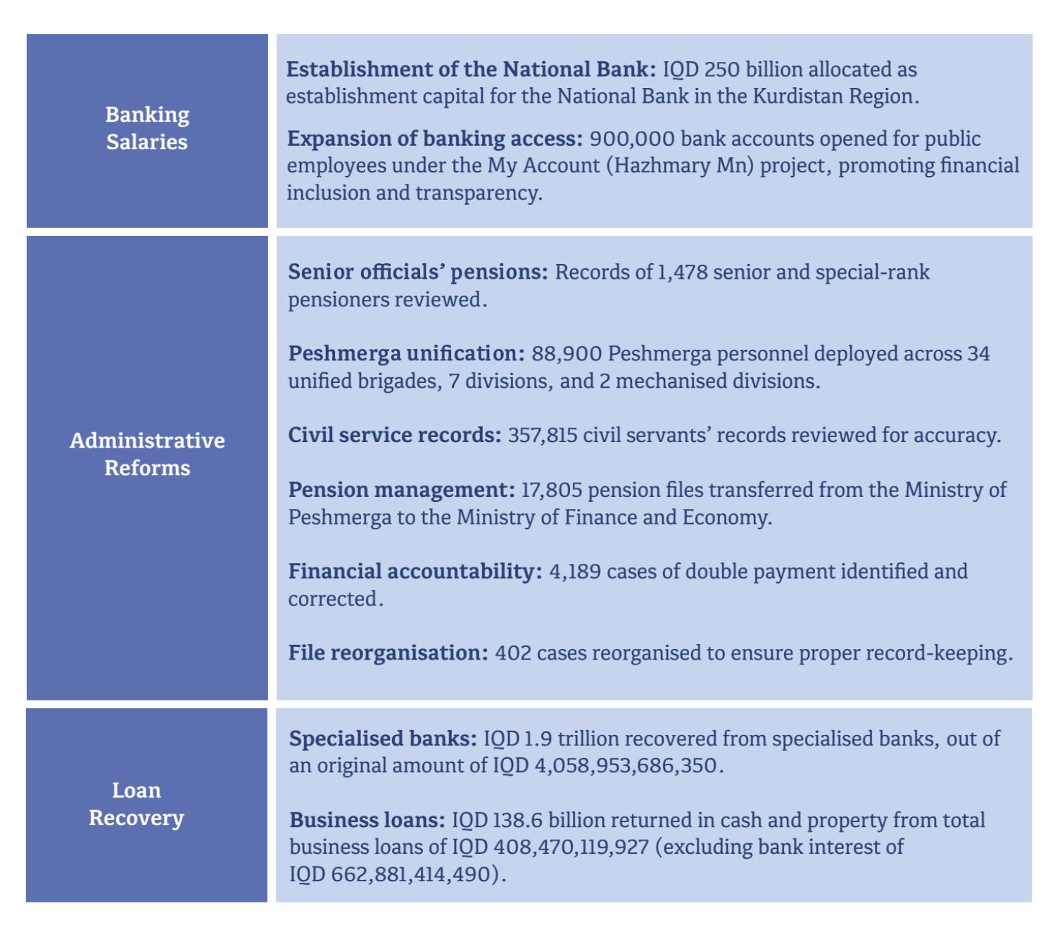 The implementation of the Reform Act, in line with its provisions, has produced significant outcomes across several key areas. Through several landmark projects, the KRG is working to combat corruption, enhance transparency, improve service quality, and strengthen good governance overall.