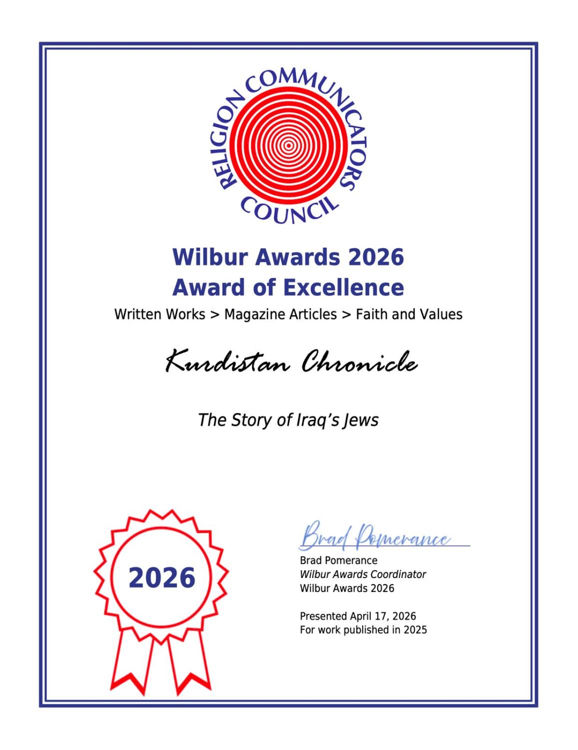 “We congratulate the Kurdistan Chronicle on being honored with an Award of Excellence for the second year in a row,” Brad Pomerance, Wilbur Awards Coordinator for RCC, said.